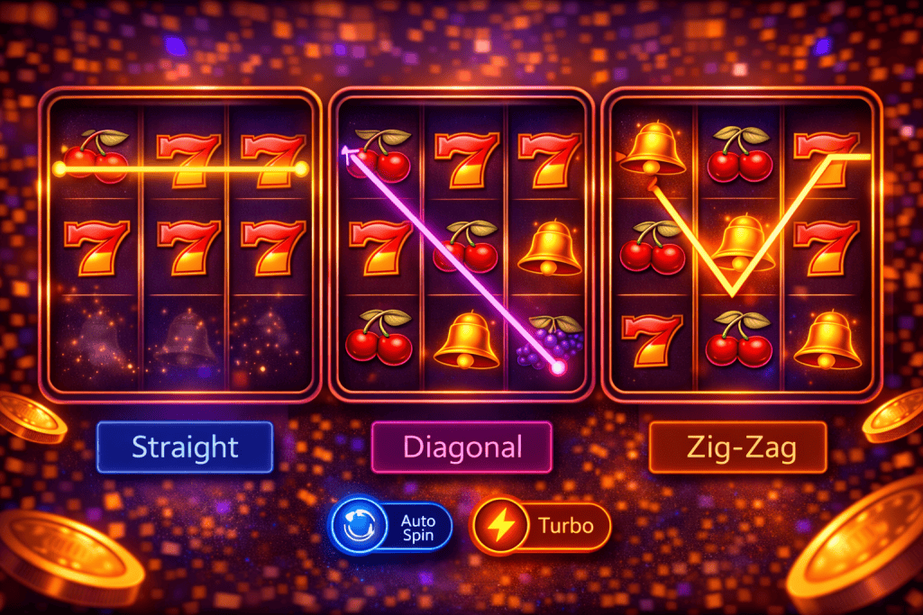 As slots exibem rolos com símbolos dispostos em linhas. Muitos jogos modernos usam configurações como 5 rolos com várias linhas visíveis, e os ganhos dependem da formação de combinações reconhecidas. Nas slots clássicas baseadas em linhas, a localização dos símbolos é importante porque os ganhos são contados ao longo das “linhas de pagamento”, que podem ser padrões retos, diagonais ou em ziguezague.